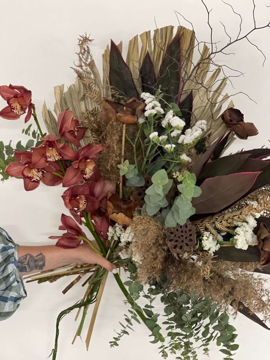 Think – orchids, cream roses, brown queen annes lace, copper beach, statice, thistle & delphinium.